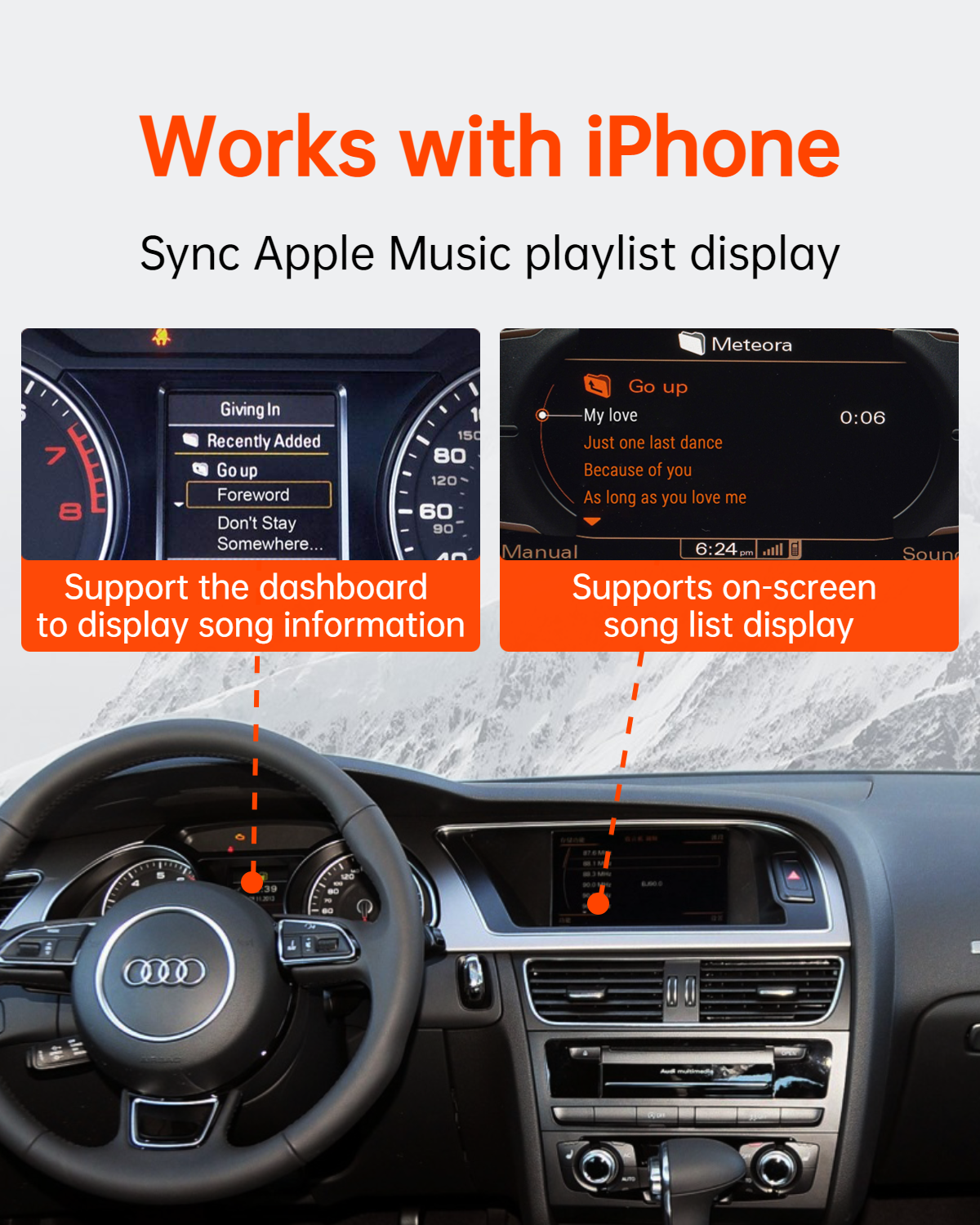 Using original steering wheel buttons and head unit buttons control to play, browse, skip and control Apple Music playlist.