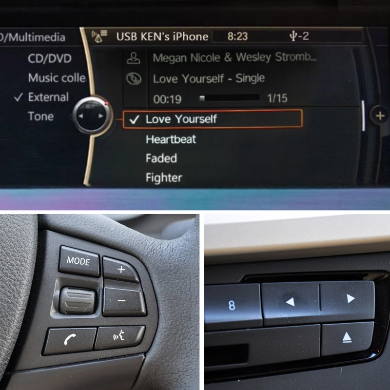 Using steering wheel buttons and CD Radio buttons controls to play, browse, skip and control Apple Music playlist.